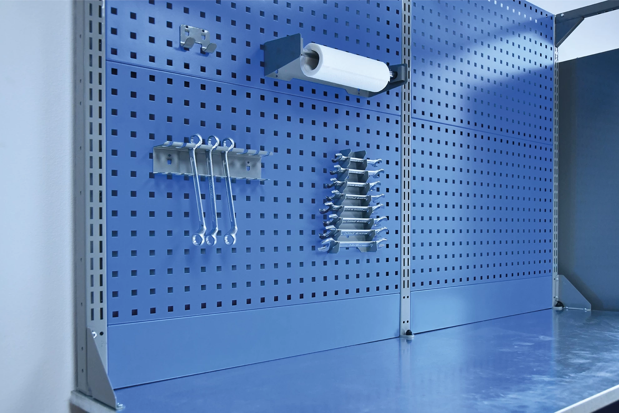 - Верстак при желании дополняется экраном из металлических перфорированных панелей, играющих сразу несколько функций: — на экран можно навесить различные держатели, карманы, крючки и лотки для размещения метизов, нетяжёлых инструментов, полотенец и прочего инвентаря;